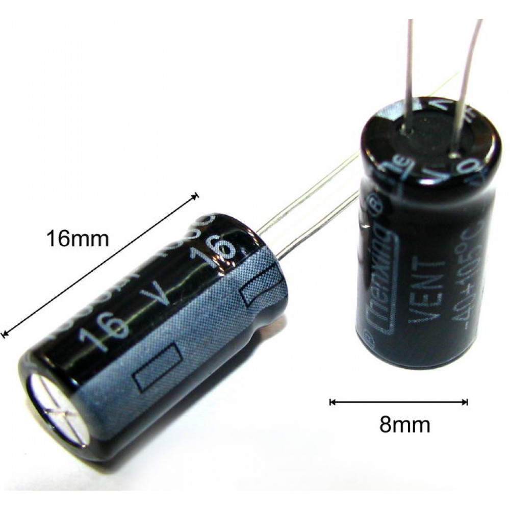 конденсатор 1000 мкФ 16 В, електролітичний конденсатор 1000 мкФ, конденсатор 105°C, конденсатор 8x16 мм, полярний конденсатор, конденсатор для стабілізації напруги.