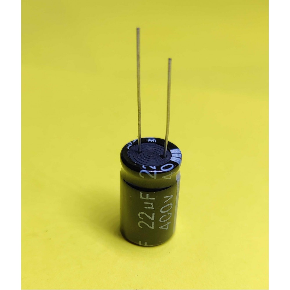 Електролітичний конденсатор 22 мкФ 400В 105°C у корпусі 10×21 мм є високовольтним компонентом, призначеним для фільтрації пульсацій, згладжування напруги та стабілізації електроживлення в електронних схемах.