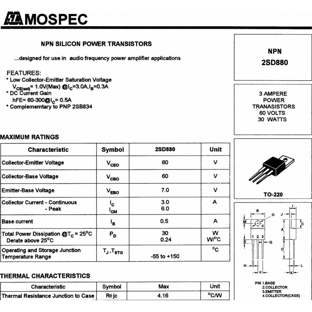 2SD880 - кремнієвий NPN силовий транзистор, призначений для використання в аудіо частотних підсилювачах потужності. Відмінні характеристики, такі як низька напруга насичення та висока стійкість до теплових навантажень, роблять цей транзистор ідеальним для промислових і побутових застосувань. Транзистор є комплементарним до типу 2SB834.