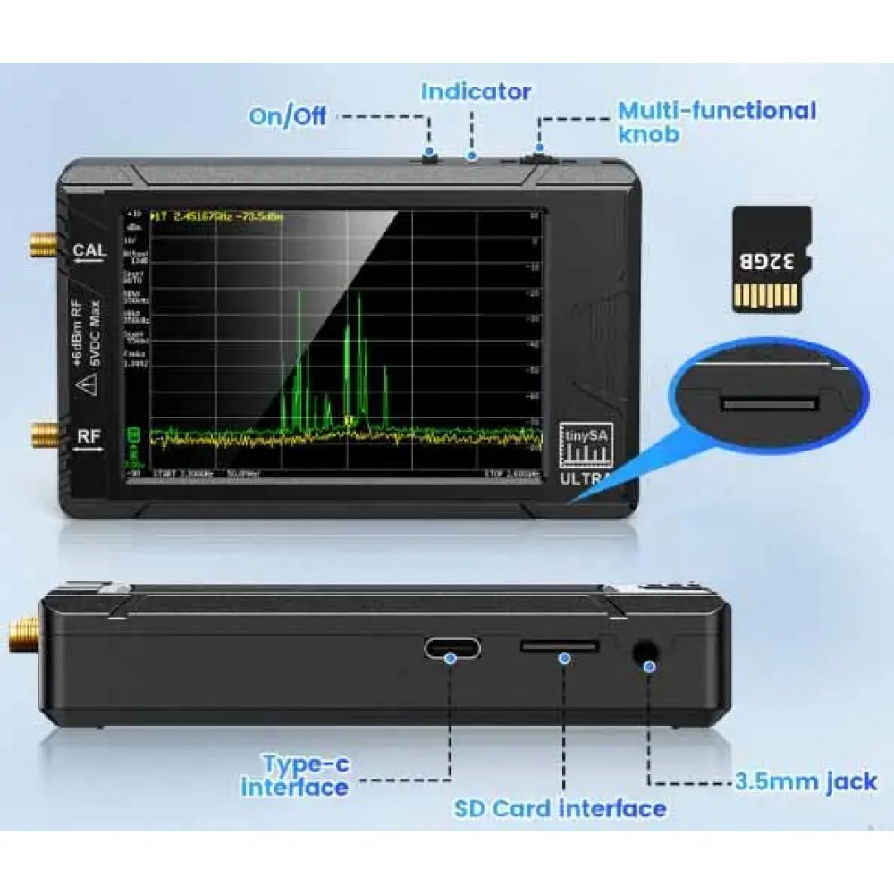 Портативний аналізатор спектру tinySA Ultra оснащений 4,0-дюймовим резистивним сенсорним кольоровим дисплеєм, який відображає повний діапазон частот при 450 точках сканування, і має в комплекті акумуляторну батарею, що забезпечує до двох годин роботи в портативному режимі. Крім того, аналізатор має два різні режими: нормальний режим та ультрарежим. TinySA Ultra має безліч вбудованих опцій налаштування, таких як смуговий фільтр, що перемикається, і ступінчастий вхідний атенюатор. Важливо пам'ятати, що максимальний вхідний рівень tinySA становить +6 дБм. Якщо ви не впевнені у рівні вхідного сигналу, рекомендується використовувати атенюатор.