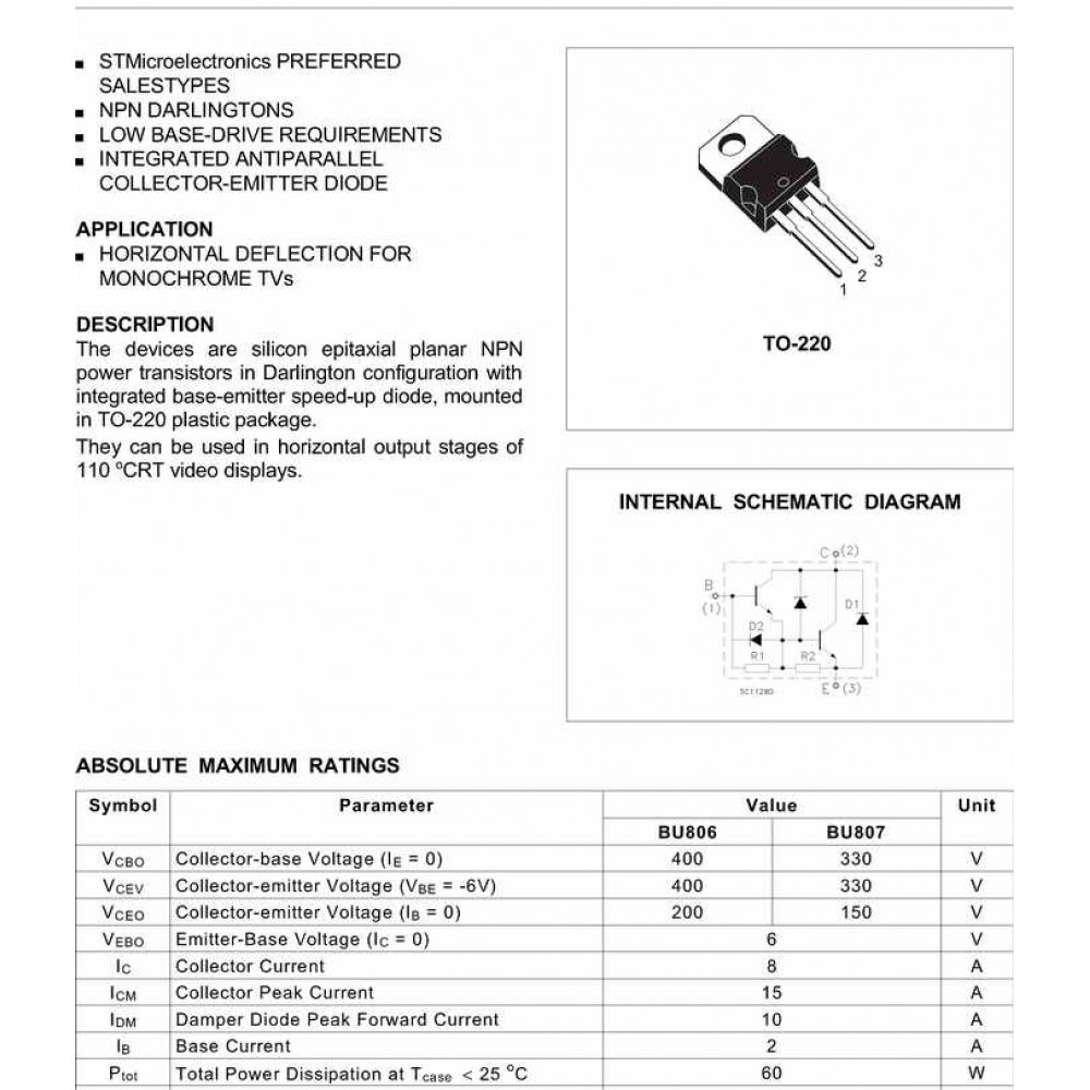 BU806 — швидкодіючий Дарлінгтон NPN транзистор у пластиковому корпусі TO-220. Включає інтегрований антипаралельний діод колектор-емітер і діод прискорення бази-емітер. Використовується в схемах горизонтальної розгортки для монохромних телевізорів. -