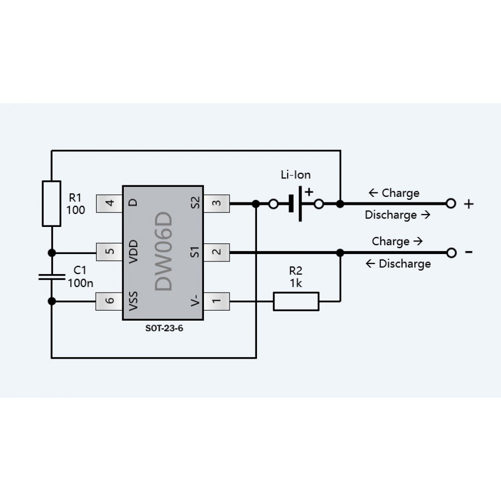 DW06 — інтегрована мікросхема захисту для літій-іонних/полімерних батарей, яка забезпечує захист від перезаряду, перевантаження, короткого замикання та інших потенційно небезпечних умов. Мікросхема містить внутрішній MOSFET з низьким RDS(ON), високоточні схеми виявлення напруги та затримки. DW06 підходить для використання в мобільних телефонах та інших пристроях, що працюють від літій-іонних/літій-полімерних акумуляторів.