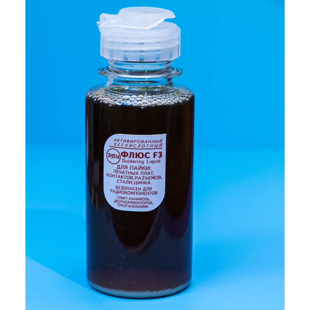 Флюс F3 - активований безкислотний флюс на спиртовій основі, спеціально розроблений для пайки друкованих плат, контактів, розʼємів, сталі, цинку та інших складних для змочування матеріалів. Завдяки активній формулі він безпечний для радіокомпонентів та не викликає корозії при правильному використанні.