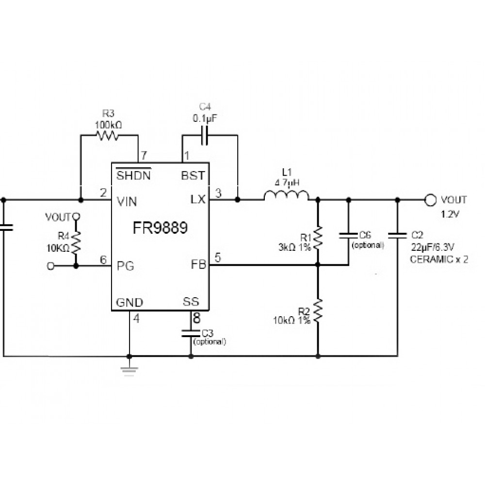 FR9889 – синхронний понижуючий DC/DC перетворювач, що підтримує вхідну напругу 4.5V – 23V та забезпечує вихідний струм до 3A. Завдяки інтегрованому низькоомному MOSFET та внутрішній компенсації пристрій забезпечує високий ККД до 95%. Він підтримує функцію Power Good для моніторингу стабільності вихідної напруги, а також має вбудований програмований Soft-Start. Захист від короткого замикання та перегріву робить цей модуль надійним рішенням для широкого спектра застосувань.
