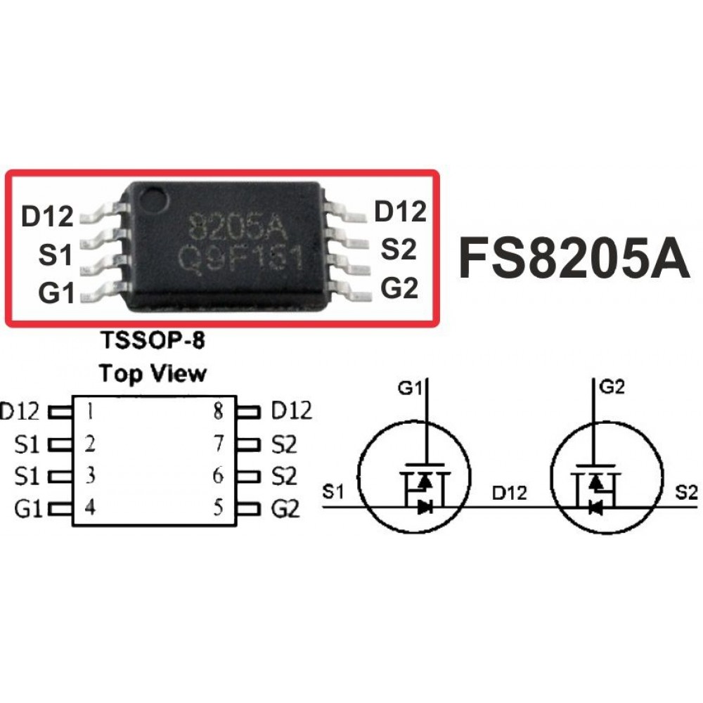 FS8205A - це високопродуктивний інтегральний подвійний MOSFET-транзистор N-типу в компактному корпусі TSSOP8 Цей компонент призначений для управління низьковольтними схемами та забезпечує високу ефективність завдяки низькому опору каналу.
