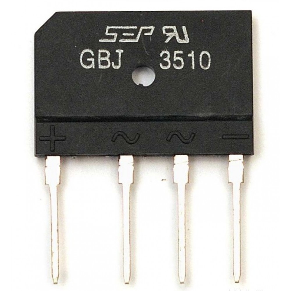 GBJ3510 - однофазний діодний міст, розроблений для ефективного випрямлення змінного струму в постійний. Завдяки скляно-пасивованій конструкції, високій потужності та низькому зворотному струму, пристрій ідеально підходить для застосування в промислових і побутових електронних пристроях.