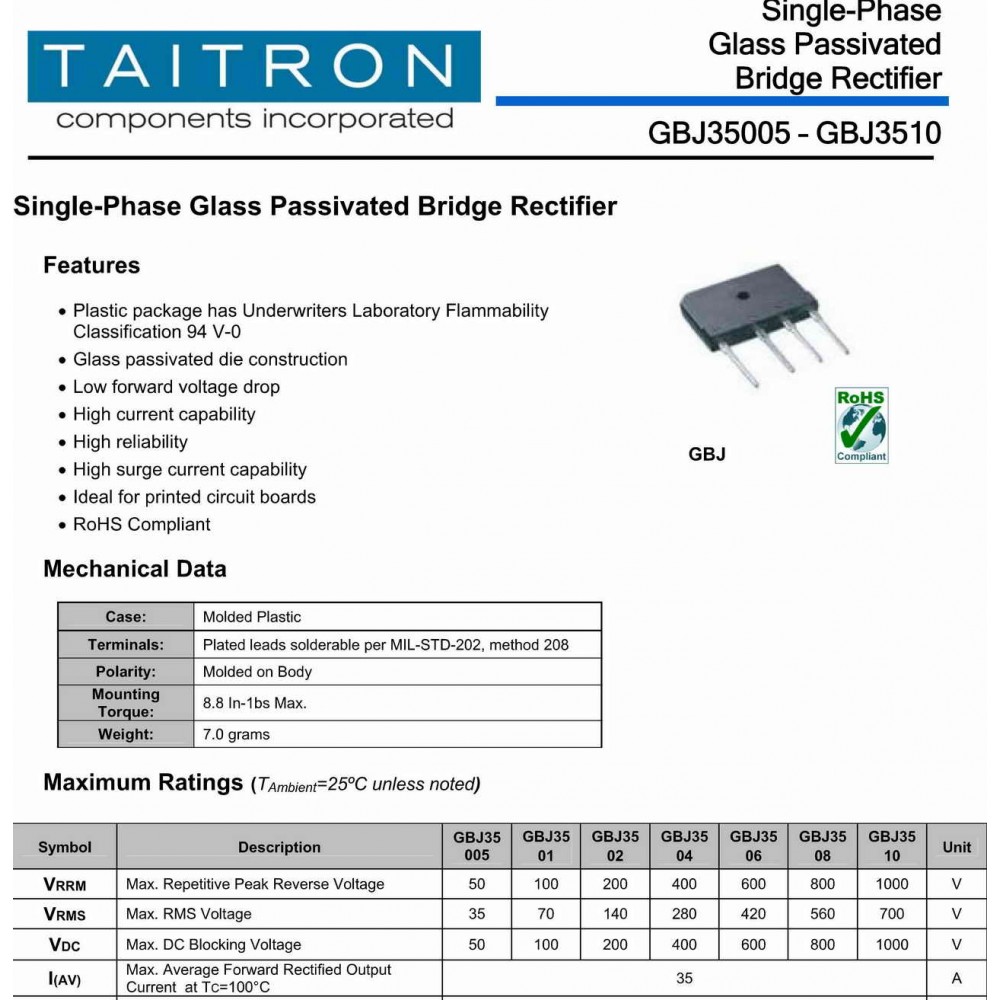 Datasheet GBJ3510 pdf Повний опис GBJ3510 - однофазний діодний міст, розроблений для ефективного випрямлення змінного струму в постійний. Завдяки скляно-пасивованій конструкції, високій потужності та низькому зворо... Читати далі...