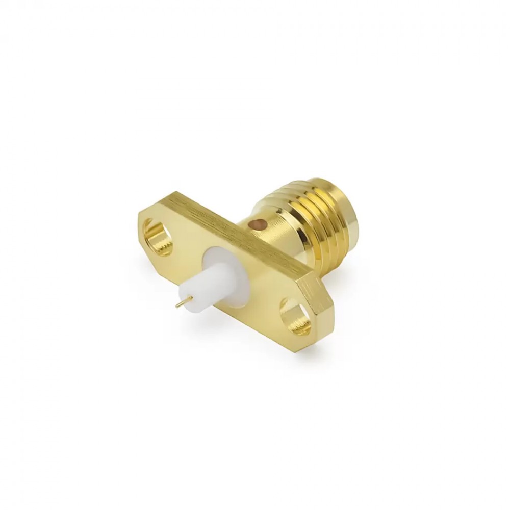 SMA роз'єм із двома монтажними отворами (фланцеве кріплення), прямий жіночий конектор з PTFE ізолятором та діелектриком довжиною 3.2 мм. Виготовлений з латуні з золотим покриттям, він забезпечує надійне з'єднання та стабільний сигнал на частотах до 18 ГГц. Призначений для високочастотних застосувань у радіочастотних і мікрохвильових системах.