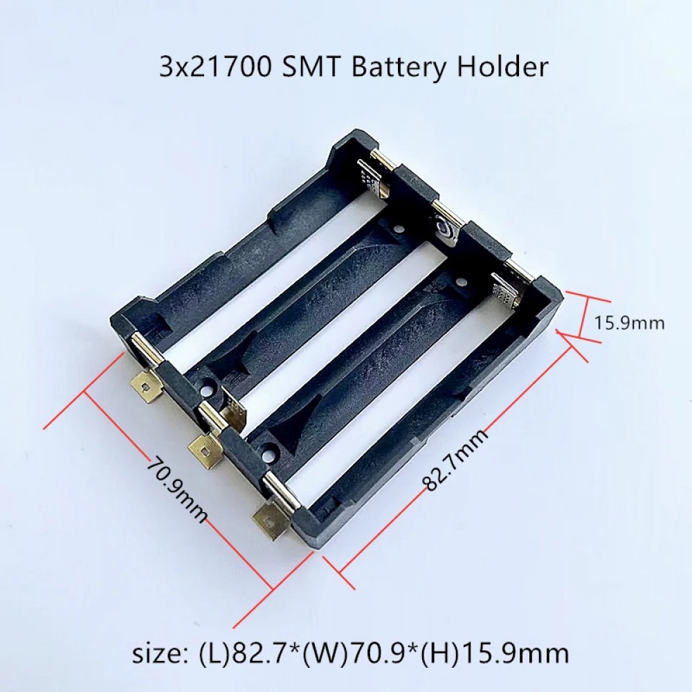 Холдер 3Х21700 SMT призначений для надійного кріплення трьох акумуляторів типу 21700. Цей холдер забезпечує зручність монтажу на поверхню (SMT) та має компактний дизайн, що робить його ідеальним для використання в портативних електронних пристроях, які потребують великої ємності живлення.