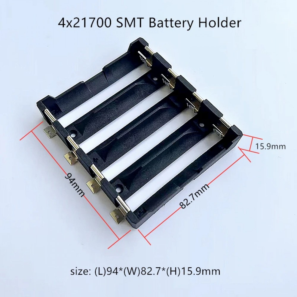 Холдер 4Х21700 SMT призначений для безпечного кріплення чотирьох акумуляторів типу 21700 з можливістю поверхневого монтажу (SMT). Це рішення ідеально підходить для пристроїв, які потребують великої кількості енергії при компактному розмірі. Міцна конструкція та зручний дизайн забезпечують надійне зберігання акумуляторів в різних електронних пристроях.