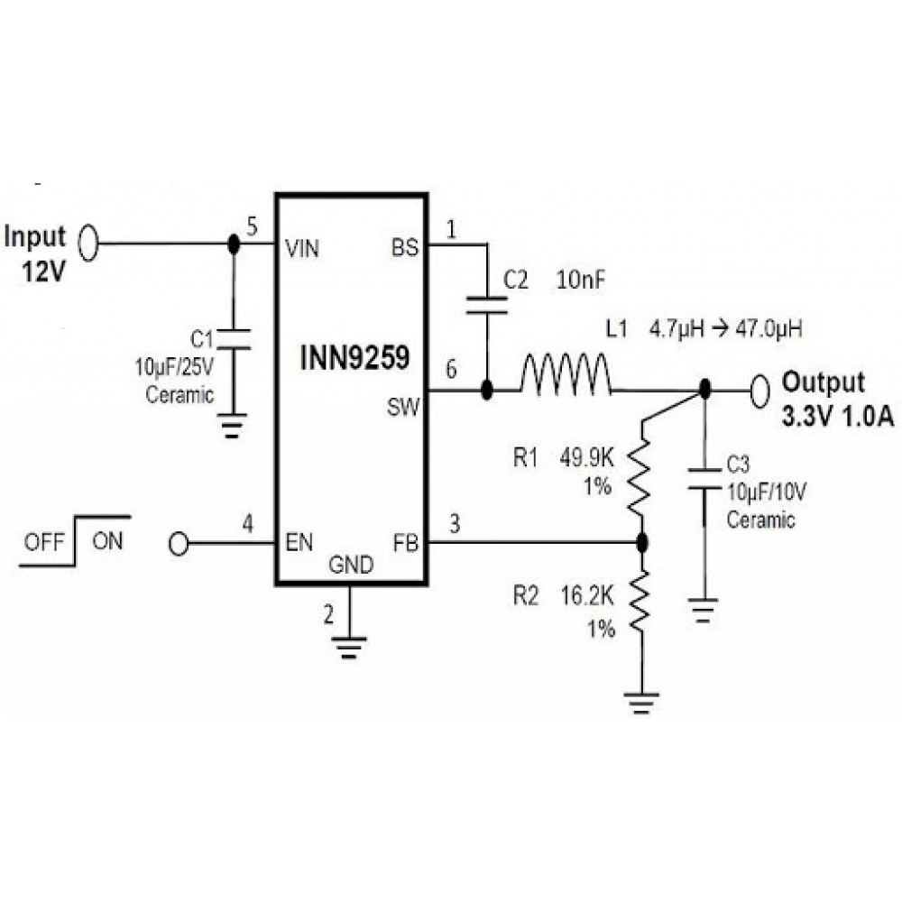 DC-DC перетворювач INN9259, низький рівень EMI, синхронний конвертер INN9259, джерело живлення для сенсорів, 1 А перетворювач напруги, SOT23-6 мікросхема INN9259, 5–23 В вхідна напруга.