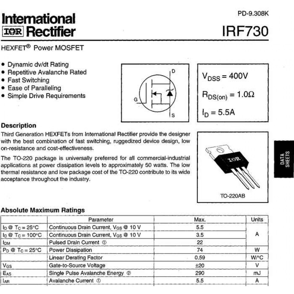IRF730N — це високоякісний n-канальний MOSFET транзистор, який відзначається високою швидкістю перемикання та низьким опором у відкритому стані. Завдяки своїм характеристикам, цей транзистор ідеально підходить для використання в джерелах живлення, перетворювачах напруги, інверторах, а також у схемах керування електродвигунами та інших силових електронних пристроях.