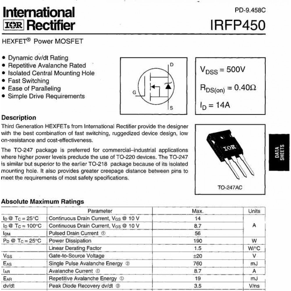 IRFP450 використовується в різних високовольтних і високочастотних додатках, таких як імпульсні джерела живлення, інвертори, перетворювачі та інші промислові додатки.
