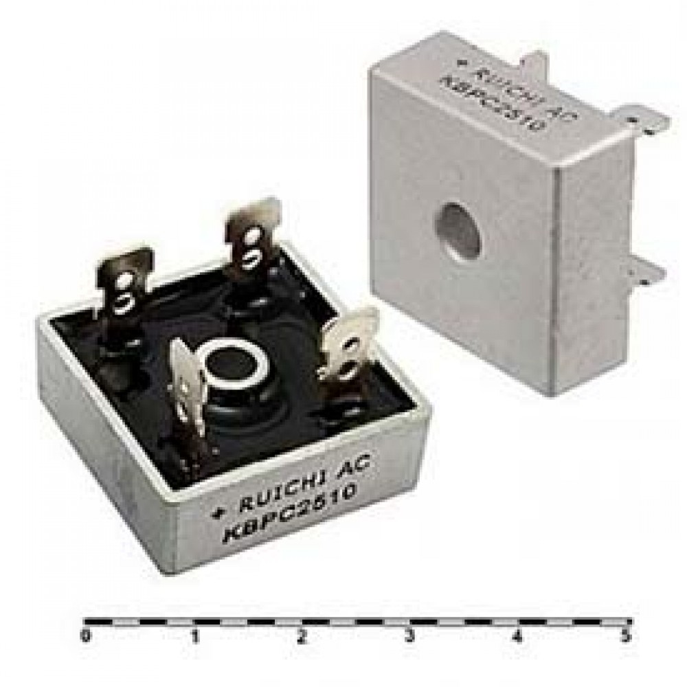 KBPC2510 — це діодний міст, який використовується для перетворення змінного струму (AC) у постійний струм (DC). Він здатний витримувати високі струми та напруги, що робить його придатним для використання в різних силових електронних пристроях, таких як джерела живлення, перетворювачі, інвертори та інші схеми, де необхідне випрямлення змінного струму.