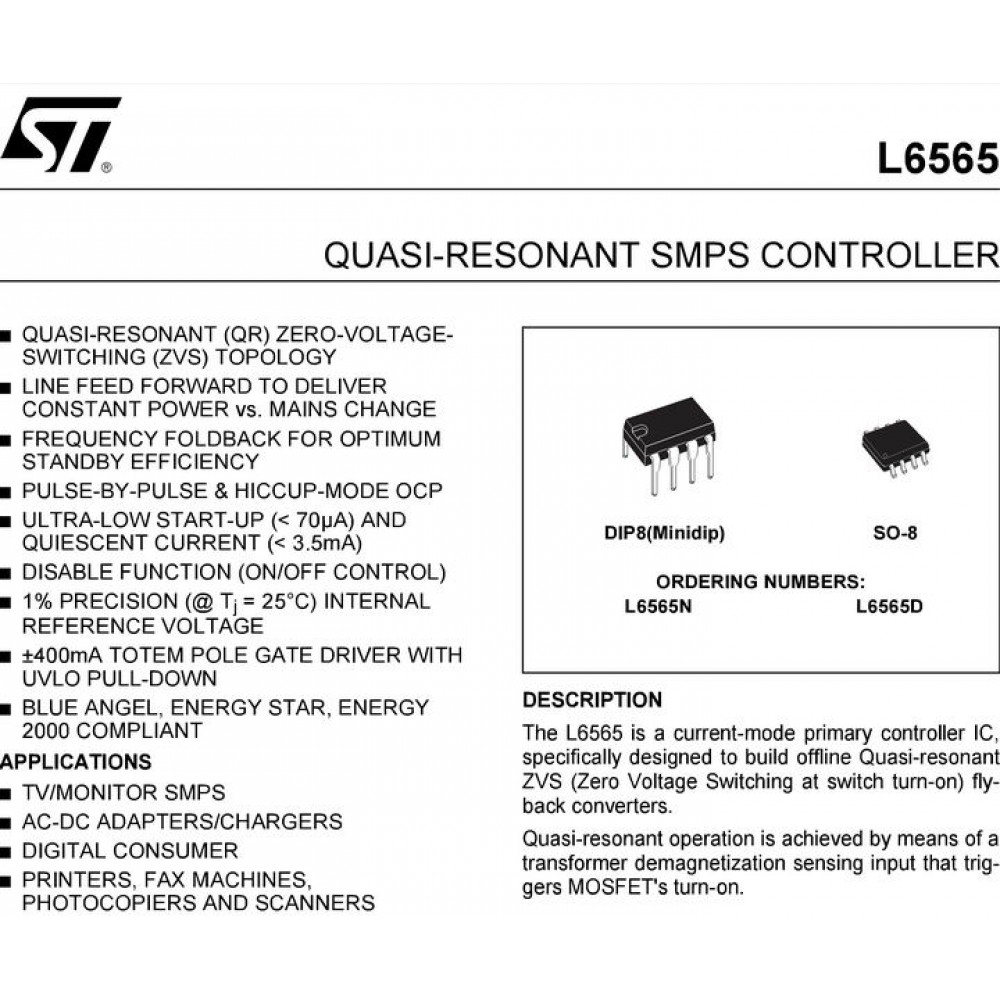 L6565 — це первинний контролер у режимі струму, спеціально розроблений для створення позасмугових (quasi-resonant) джерел живлення на основі ZVS (Zero Voltage Switching). Він забезпечує високий коефіцієнт ефективності, завдяки низькому енергоспоживанню та підтримці частотного регулювання. Використовується для адаптерів, зарядних пристроїв, телевізорів, моніторів, принтерів та інших цифрових пристроїв.