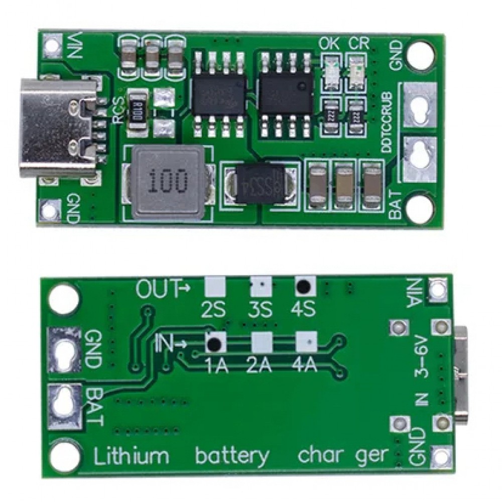 Цей модуль призначений для зарядки літій-іонних акумуляторів у конфігурації 4S з максимальним струмом 1А. Підходить для живлення від 3-6V, оснащений Type-C портом для підключення джерела живлення. Забезпечує контроль напруги, струму зарядки та захист від перенапруги для безпечної та ефективної роботи. Вихідна напруга для зарядки становить до 16.8V, що відповідає стандарту для 4S Li-ion батарей.