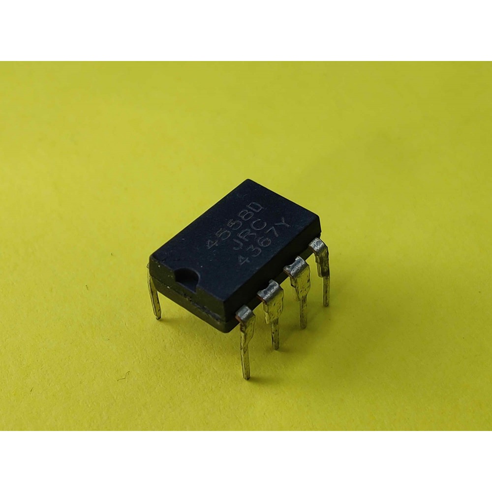 NJM4558D, подвійний операційний підсилювач, DIP-8 корпус, низький рівень шуму, 3 МГц смуга пропускання, 100 дБ коефіцієнт підсилення, вимірювальні прилади.