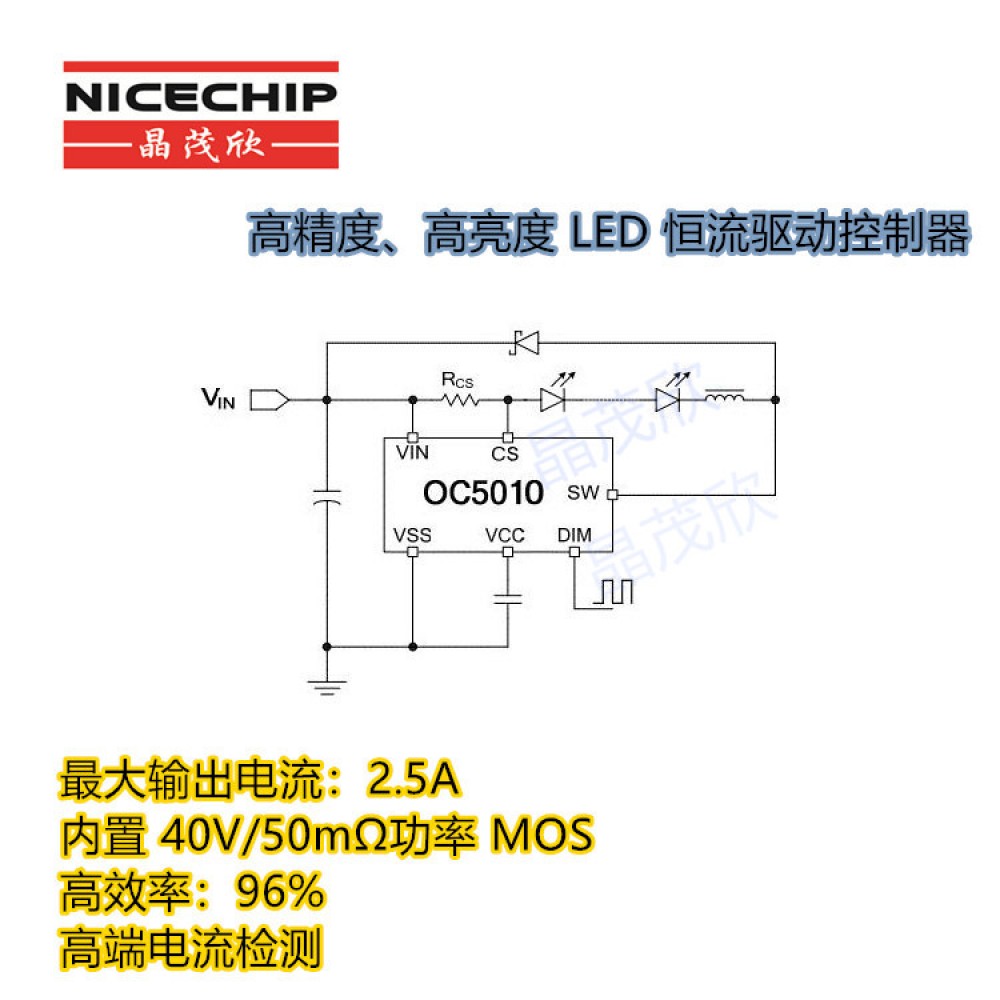 OC5010B - високоефективний LED-драйвер із вбудованим 5А MOSFET, розроблений для живлення світлодіодів із високою яскравістю. Цей драйвер підтримує широкий діапазон вхідної напруги (5.5В–40В), високоточне регулювання с... Читати далі...