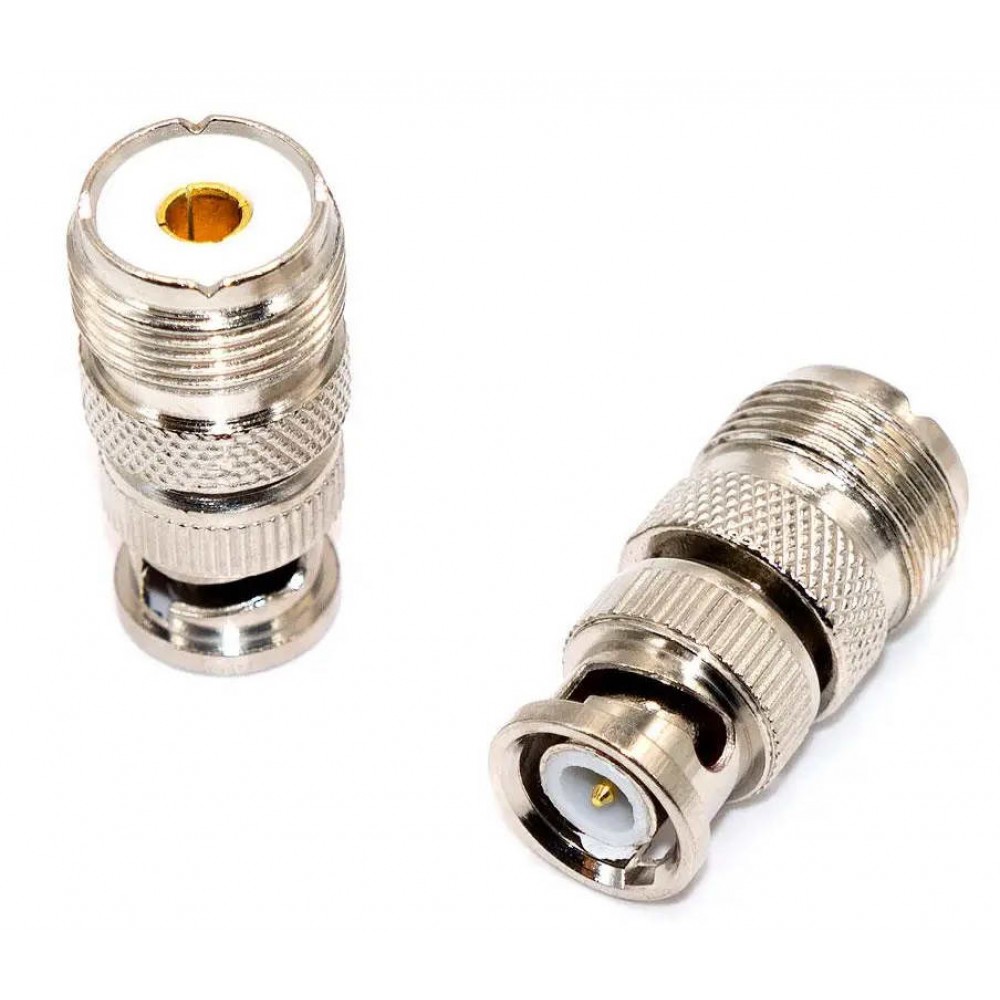 Перехідник штекер UHF - гніздо BNC – це коаксіальний роз'єм, який дозволяє з'єднати кабелі або пристрої з різними типами роз'ємів UHF (PL-259) та BNC. Такий перехідник широко використовується у радіочастотних додатках, включаючи аматорські радіосистеми, телекомунікаційне обладнання та вимірювальні прилади.