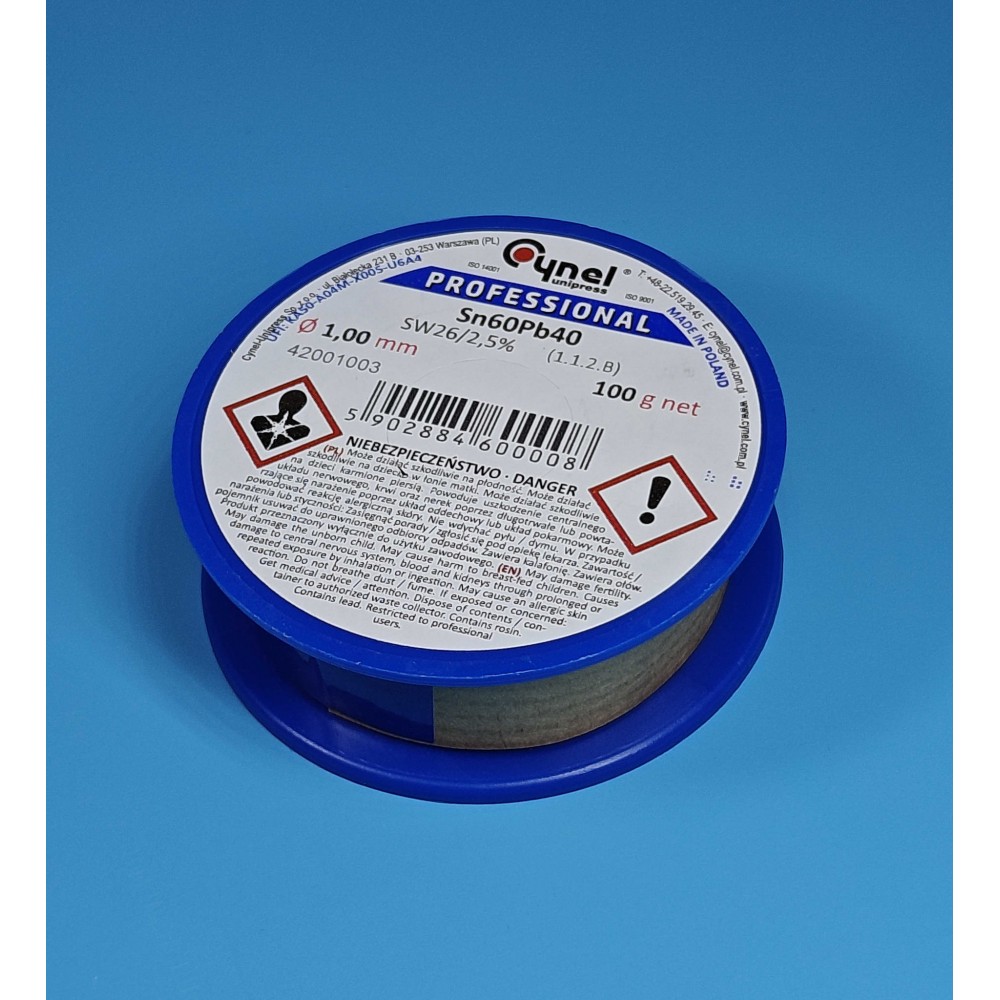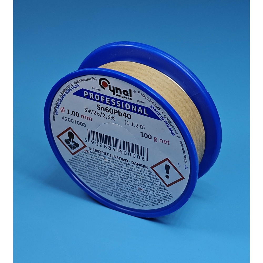 припій Cynel 1.0 мм, припій Sn60Pb40, паяльний дріт 100 г, флюсовий припій 2.5%, дріт з флюсом SW26, каніфольний припій, паяльна проволока 60/40, припій для електроніки, паяльний дріт Cynel, дріт паяльний Польща, флюсовий дріт Cynel, професійний припій Cynel, припій у котушці, припій з флюсом 1 мм, паяльний матеріал Cynel, припій для монтажу плат, дріт з каніфоллю, припій для радіоапаратури, припій Cynel 60/40, паяльний дріт для техніки