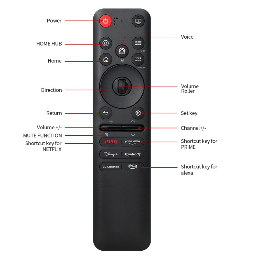 - Кнопки швидкого доступу: Netflix, Prime Video, Disney+, Rakuten TV, LG Channels, Alexa