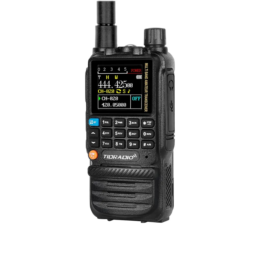 Портативна багатосмугова радіостанція з кольоровим дисплеєм 1.44", акумулятором 2500 mAh і вихідною потужністю до 5 Вт. Підтримує прийом FM та AM, у тому числі авіадіапазону, NOAA погоди, програмування через USB-C і бездротово, VOX, сканування CTCSS/DCS, клонування налаштувань та DTMF-блокування.