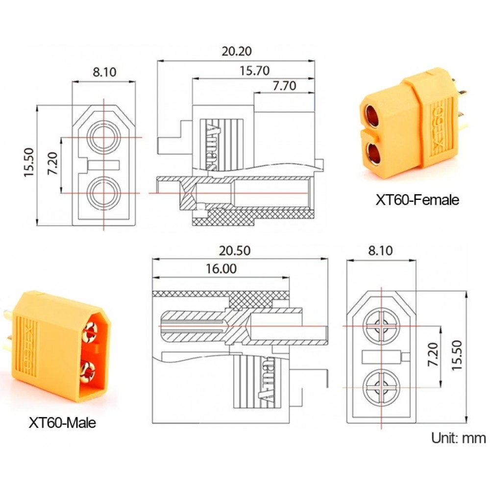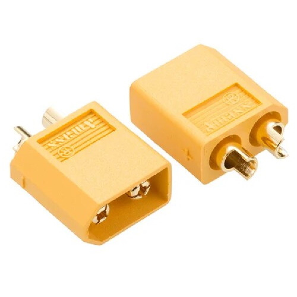 Конектор XT60 - надійний модульний роз'єм, створений для з'єднання компонентів у схемах із високим струмом. Виготовлений із термостійкого нейлону, він може витримувати екстремальні температури без деформації. Позолочені контакти забезпечують мінімальні втрати електроенергії навіть за тривалого використання у високонавантажених схемах. Конектор XT60 сумісний із різними типами акумуляторів і електронних пристроїв.