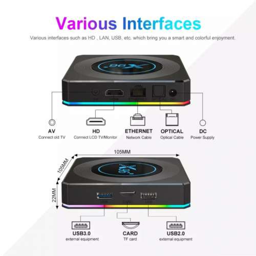 Android TV Box X96 X4 - новий гаджет з операційною системою Android 11.0, який оснащено процесором Amlogic S905X4 з графічною відеокартою ARM Mali-G31 MP2, що дає можливість приставці працювати зі всіма вимогливими програмами та транслювати контент у високій якості. Оригінальний дизайн приставки, над яким постаралися виробники. В Android X96X4 є своє RGB підсвічування з купою кольорів на Ваш вибір.