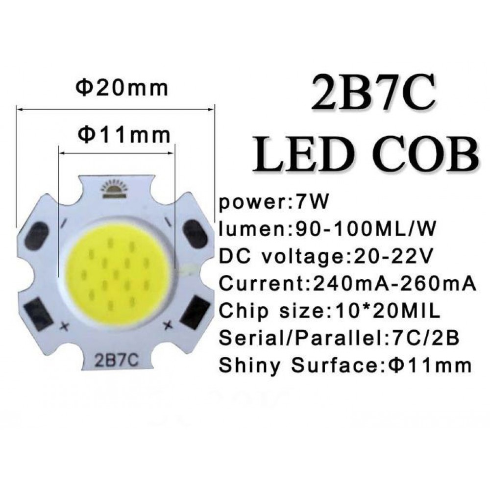 Світлодіодний COB модуль потужністю 7 Вт з високою світловою ефективністю 90-100 люмен/Вт. Працює при напрузі постійного струму 20-22 В та підходить для освітлювальних приладів, які потребують яскравого, стабільного і рівномірного освітлення.