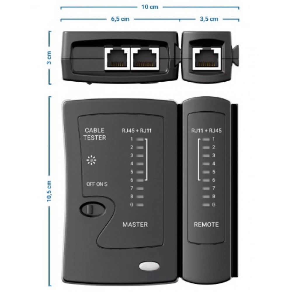 Цей тестер кабелю призначений для швидкої перевірки цілісності мережевих (RJ45) та телефонних (RJ11) кабелів. Його можна використовувати як у домашніх умовах, так і для професійного тестування кабельних систем у офісах, сервісних центрах та інсталяційних службах.
