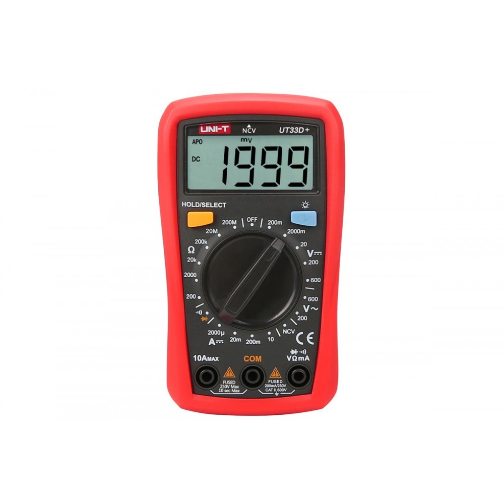 Мультиметр UT33D + застосовується для вимірювання постійного і змінного напруги в діапазоні до 600В AC / DC, сили струму DC до 10А , опору до 200 МОм, також виконання перевірки діодів і тестування на провідність. Вибір меж вимірювань проводиться вручну.