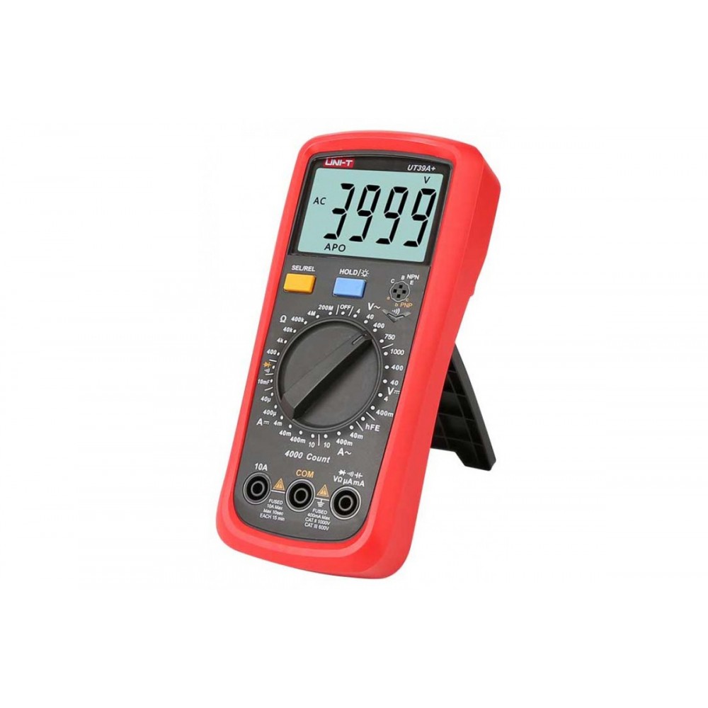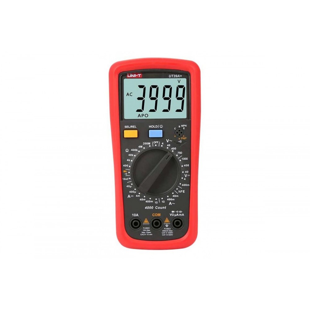 UNI-T UT39A + нова модель мультиметра цифрового ( тестера ) , призначений для вимірювання постійного і змінного напруги AC / DC, опору, ємності, а також виконання перевірки діодів, транзисторів і тестування на провідність.