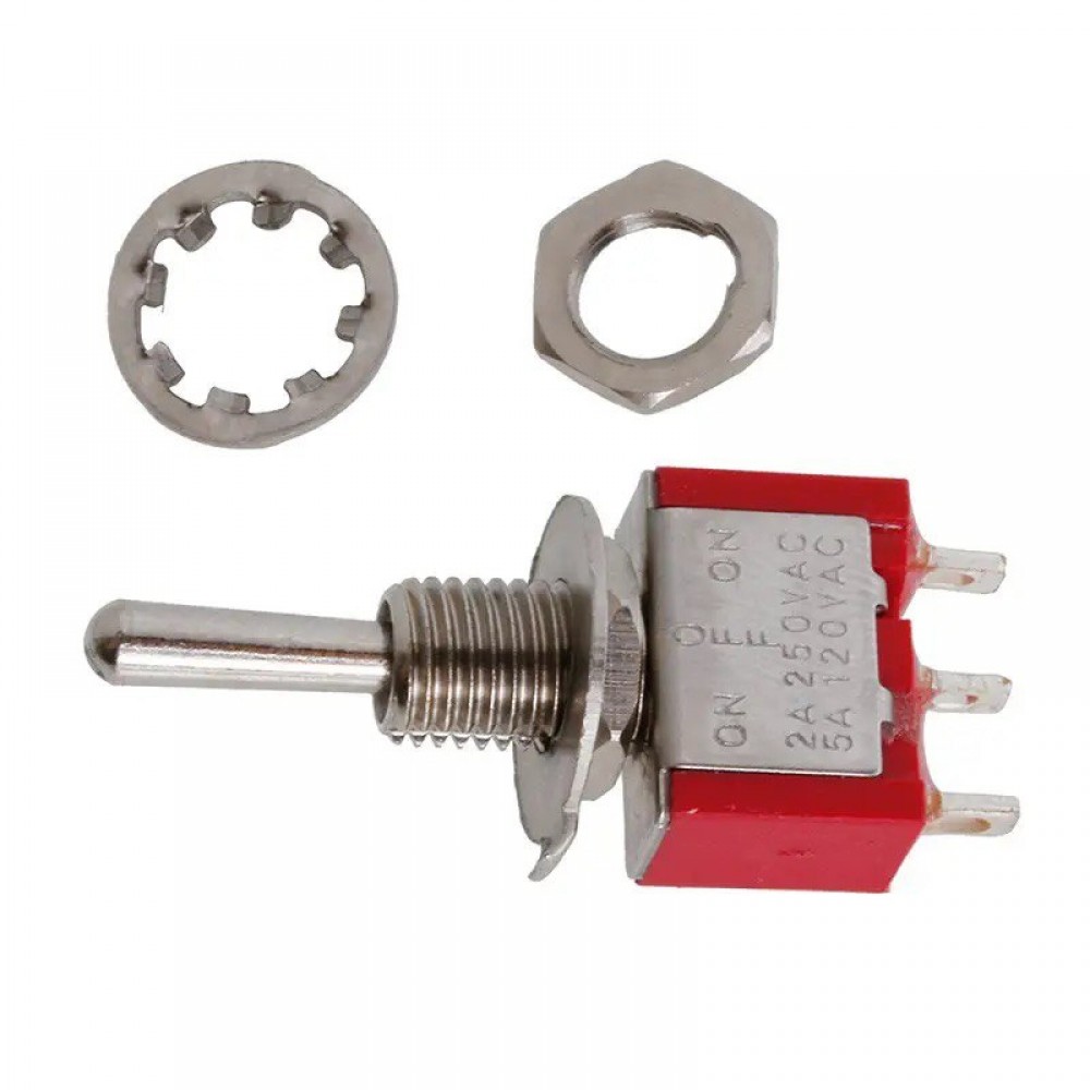 Тумблер Daier MTS-103 призначений для комутації електричних ланцюгів. Трьохконтактний. Номінальне значення струму 3А для 250В змінної напруги, або ж 6А для 125В змінної напруги. Є фіксація положень перемикача.