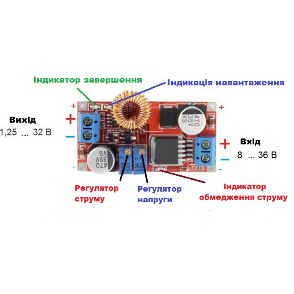 - Вихідна напруга: 1,25-36 В (регульована)
