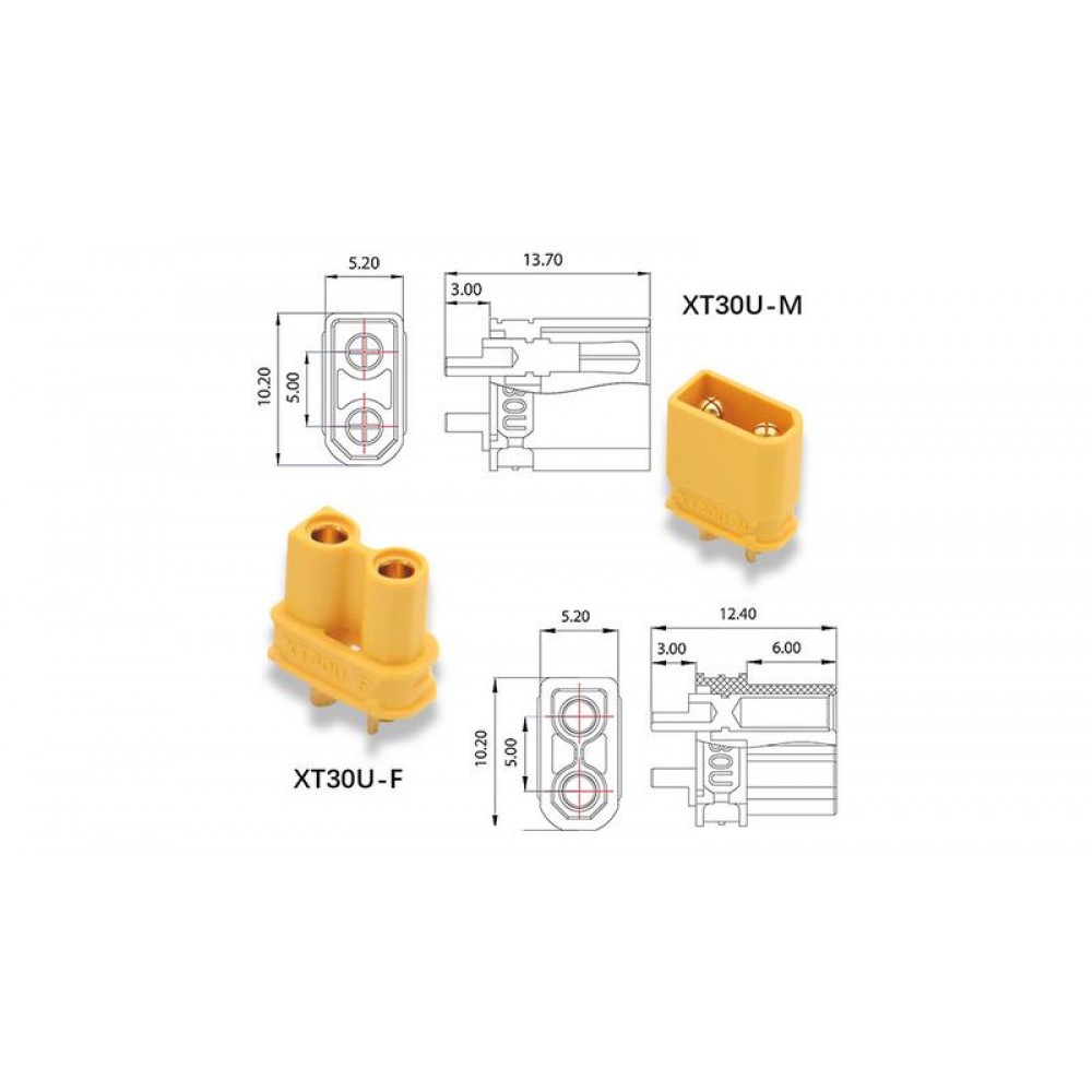Конектор XT30 – це високоякісний і надійний роз'єм, широко використовуваний у різних електронних пристроях, особливо в моделях радіокерованих (RC) автомобілів, дронів, а також в інших застосуваннях, де потрібна надійна передача струму.