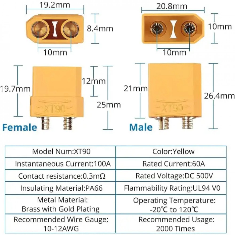 Конектор XT90 – це високоякісний і надійний роз'єм, призначений для з'єднання високопотужних електронних пристроїв, таких як акумулятори та двигуни в радіокерованих моделях, електричних транспортних засобах, дронах та інших додатках, що потребують стабільного високострумного з'єднання.